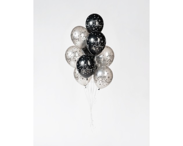 - 10 balonów srebrno czarnych z nadrukiem happy birthday napełnionych helem
