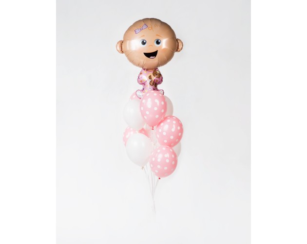Biało różowy zestaw składający się z foliowego balonu w kształcie bobasa oraz 10 balonów lateksowych (białych i różowych). Różowe balony posiadają nadruk w kształcie białych kropek. Całość tworzy bardzo miłą kompozycję idealną na Baby Shower.