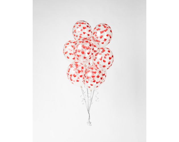 - 10 przezroczystych balonów z nadrukiem czerwonych serc napełnionych helem