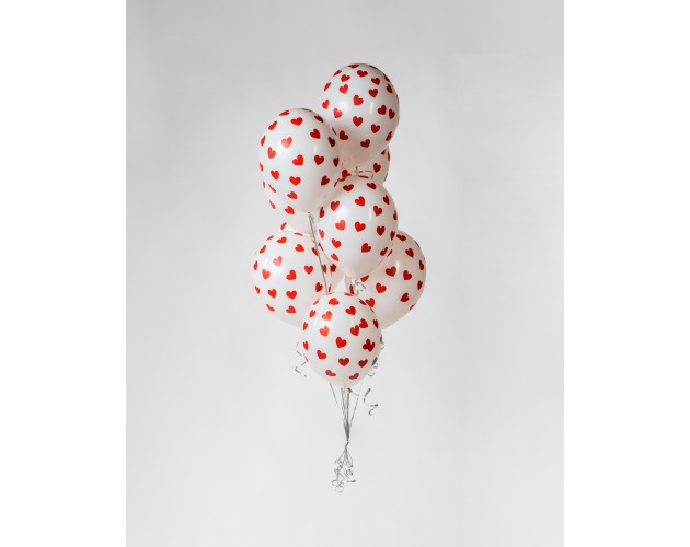 - 10 białych balonów z nadrukiem czerwonych serc napełnionych helem