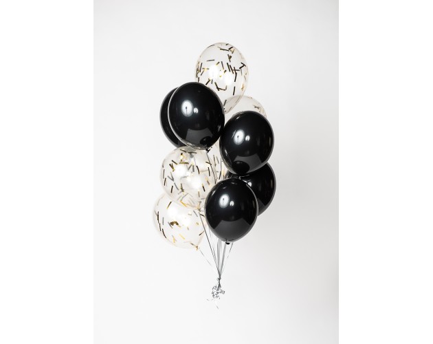 Jedyny w swoim rodzaju mix balonów z helem, czarne oraz złote konfetti okażą się strzałem w dziesiątkę podczas imprezy. Zestawienie to zadowoli najbardziej wymagającego baloniarza. Doskonale sprawdzi się też jako dodatek do prezentu lub kwiatów.