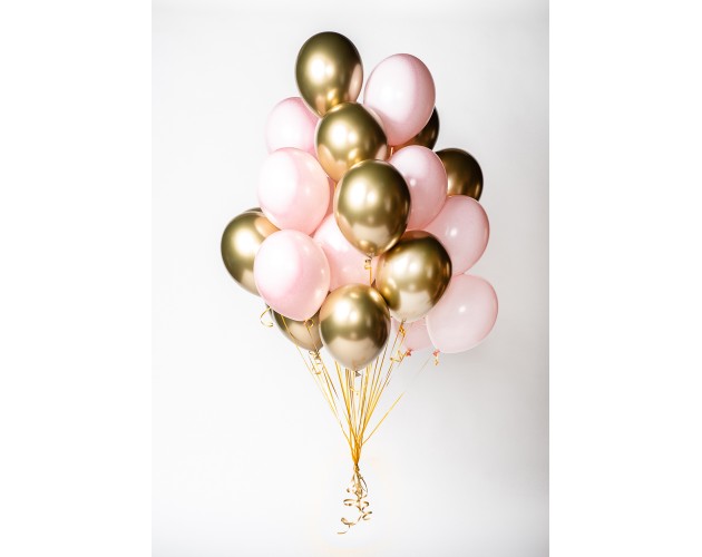 Chromowane złoto plus pudrowy róż ? Ten zestaw jest przykładem że balony z helem już dawno nie kojarzą się z czymś kiczowatym tylko są estetyczną formą dekoracji. Zestaw ten świetnie nada się na ślub lub jako dodatek do prezentu.