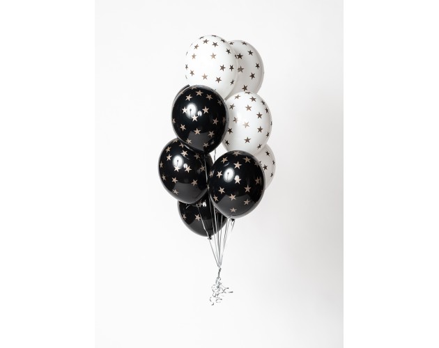 - - 10 balonów białych i czarnych w złote gwiazdki napełnionych helem