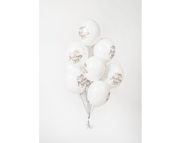- 10 balonów białych z nadrukiem "happy birthday to you" napełnionych helem
